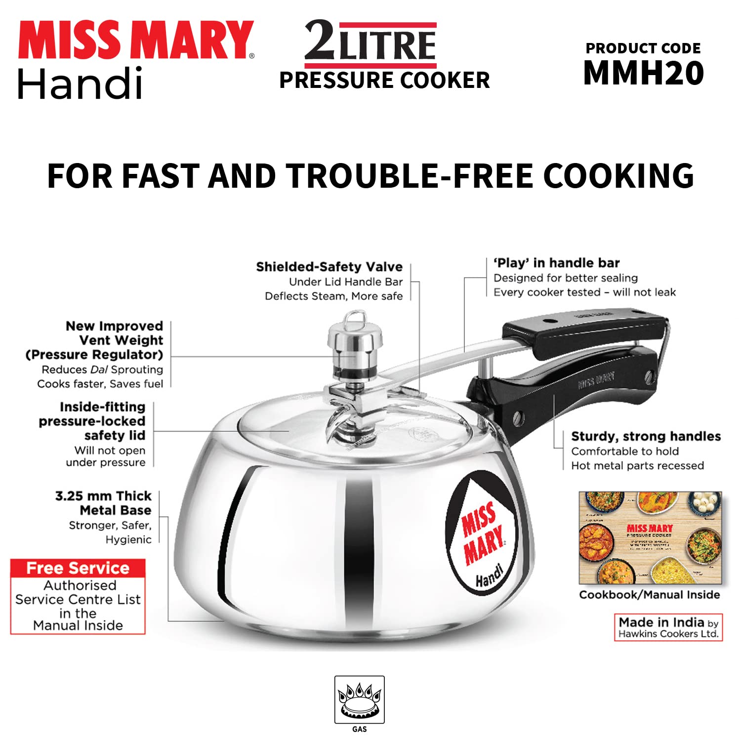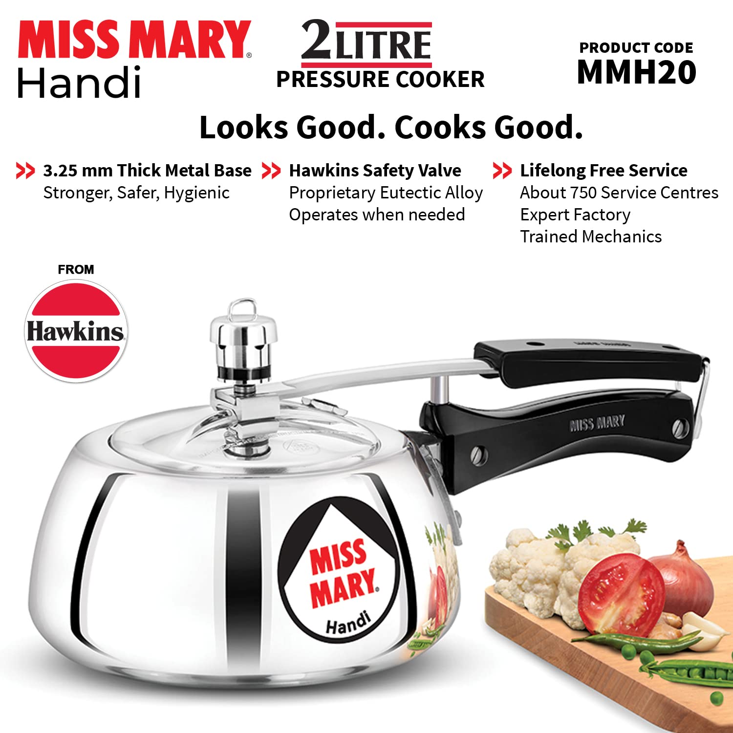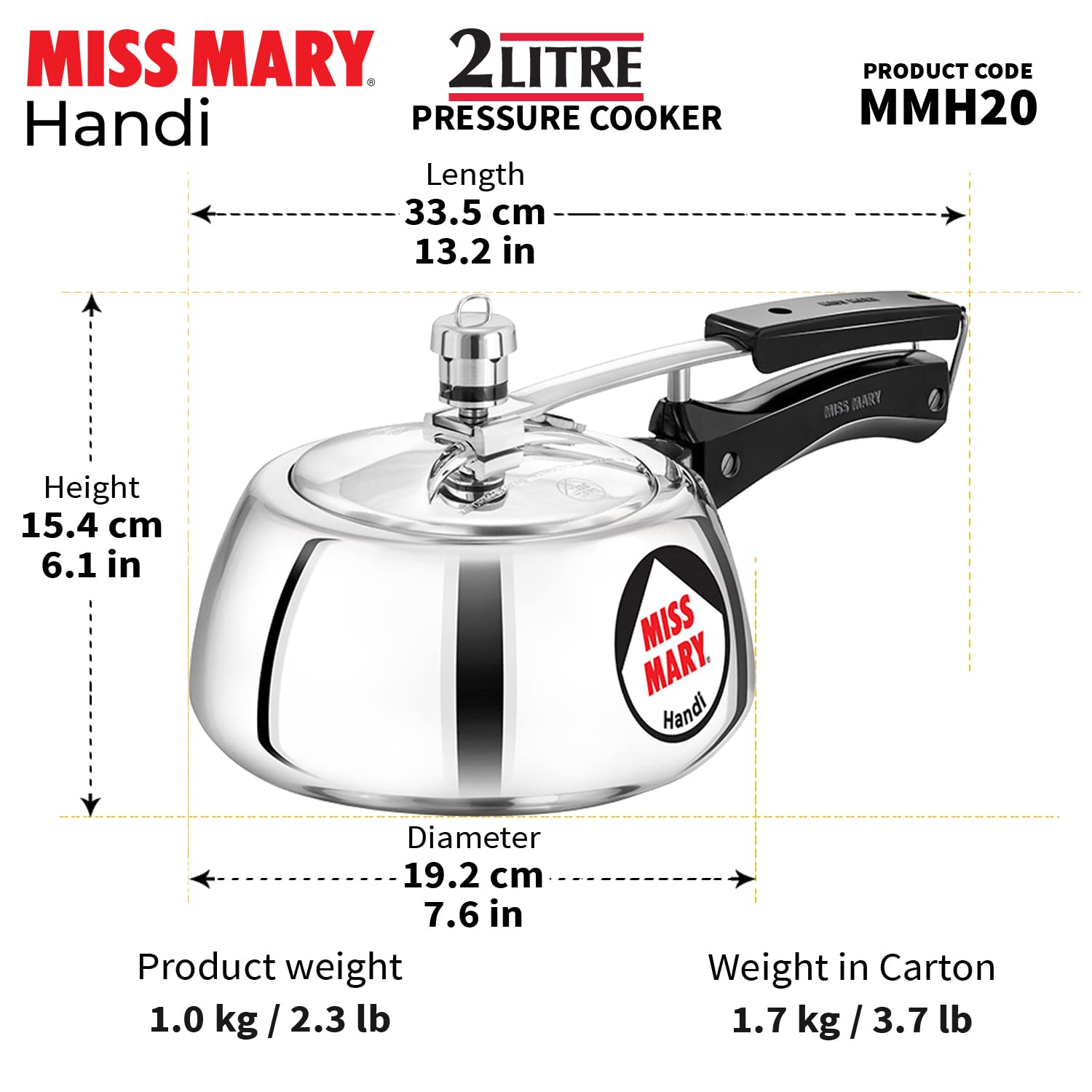 Hawkins 2 Litre Miss Mary Handi Pressure Cooker, Small Inner Lid Cooker, Silver (MMH20),Aluminium