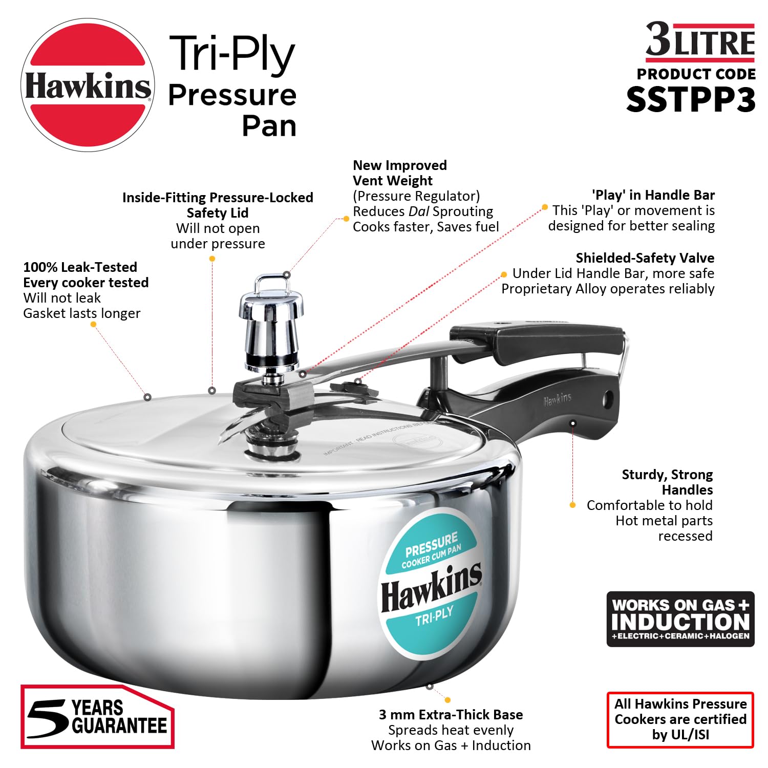 • 3 mm Extra-Thick Triply Stainless Steel – less burning of food