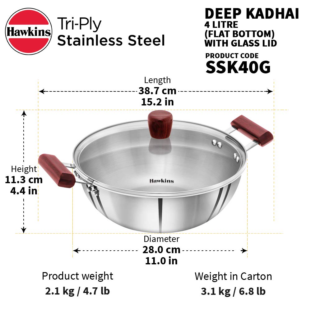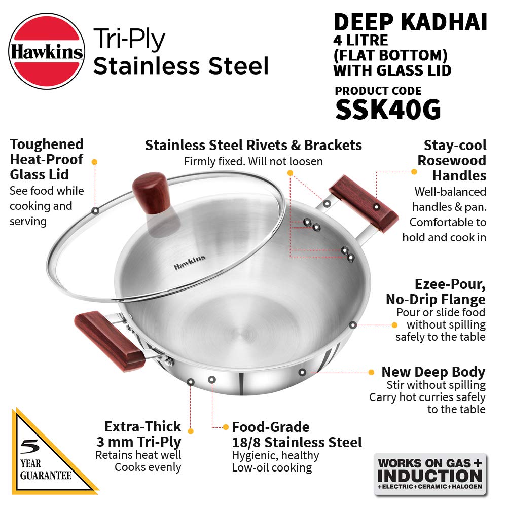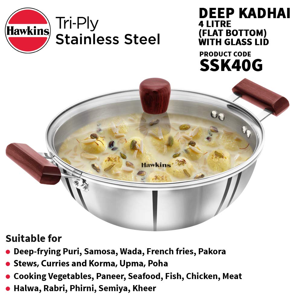 Hawkins 4 Litre Deep Kadhai, Triply Stainless Steel Kadai with Glass Lid, Flat Bottom Induction Kadhai, Big Kadai, Silver (SSK40G)