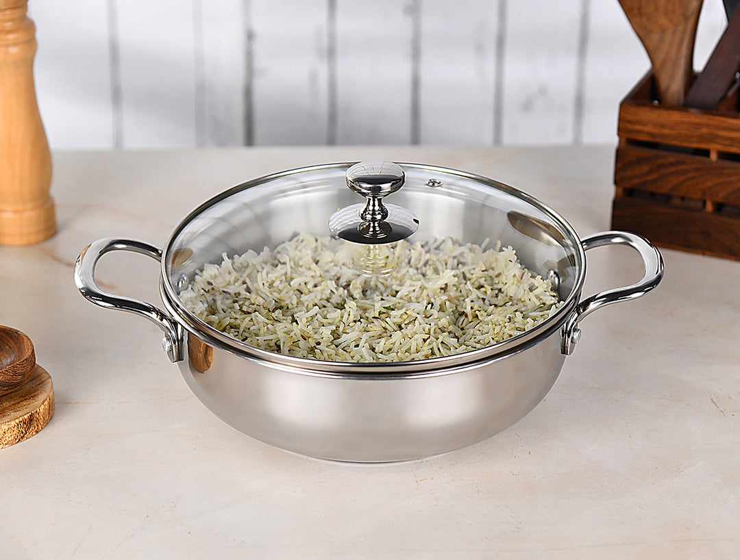 Superior hygienic stainless steel Kadhai having glossy mirror finish outside and matt finish inside for rich premium feeling. Firmly riveted stainless steel handle with two rivets for long lasting usage.