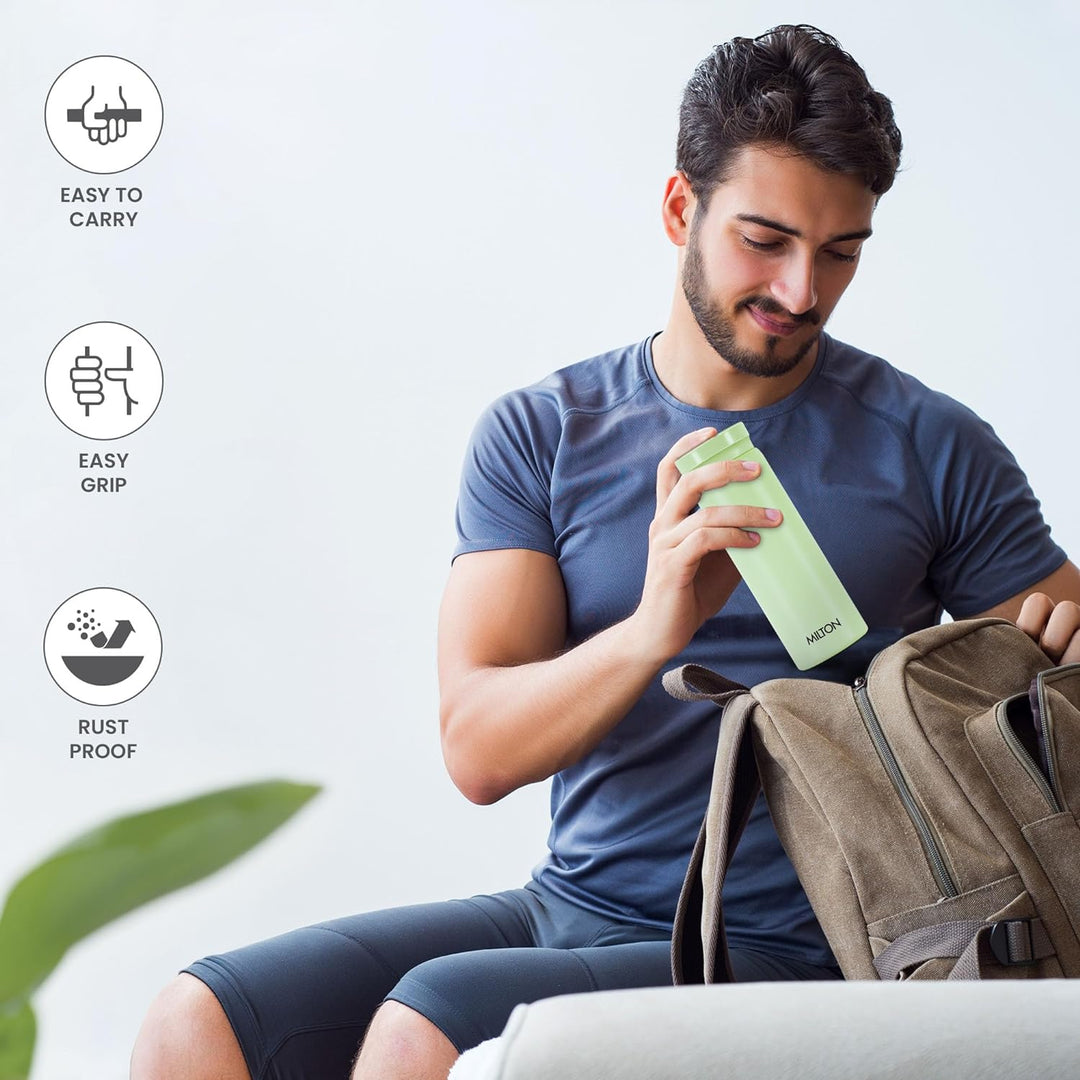 - This portable bottle from Milton flaunts a beautifully slender construction which looks sleek, elegant and attractive. The smooth steel body is a delight to hold in your hands.
