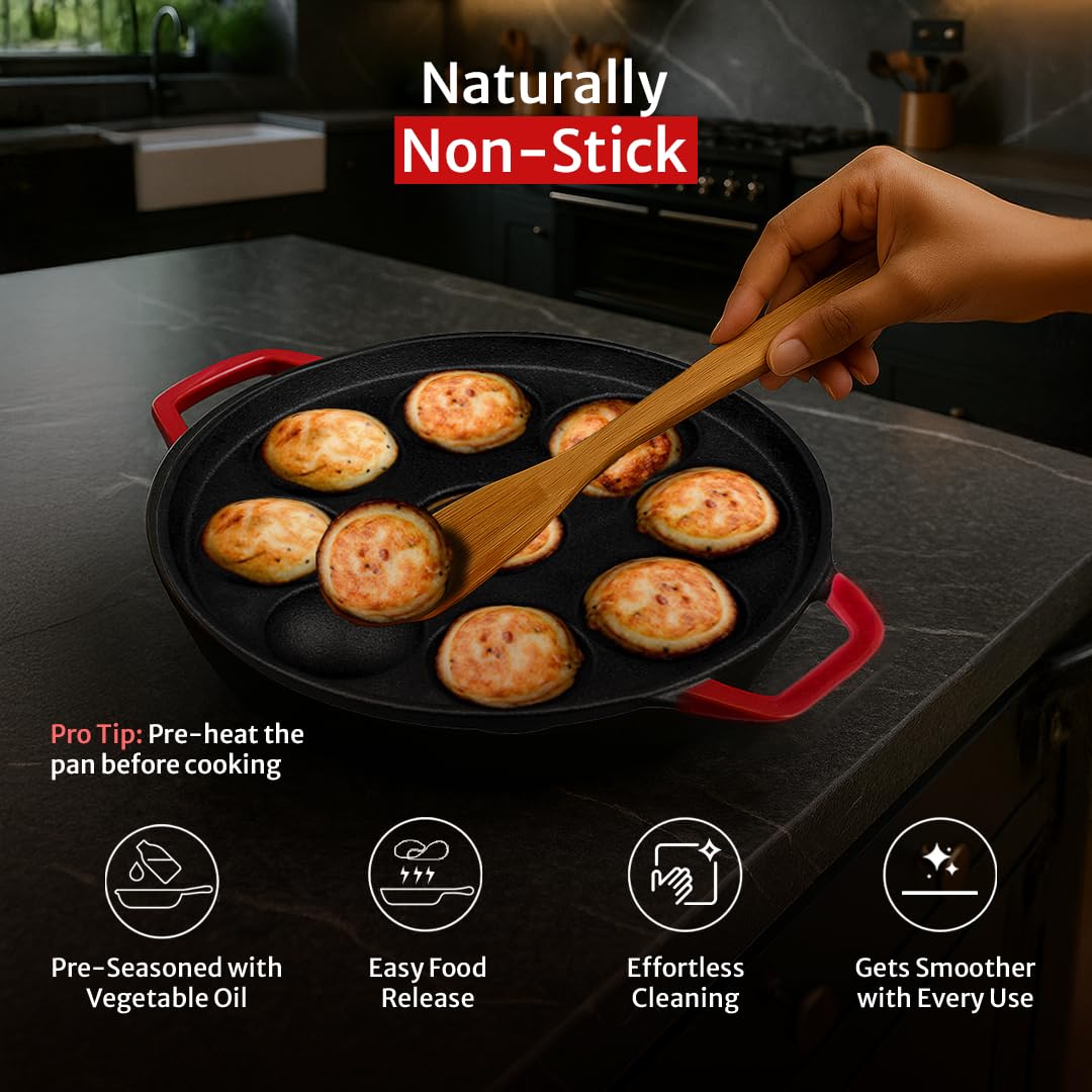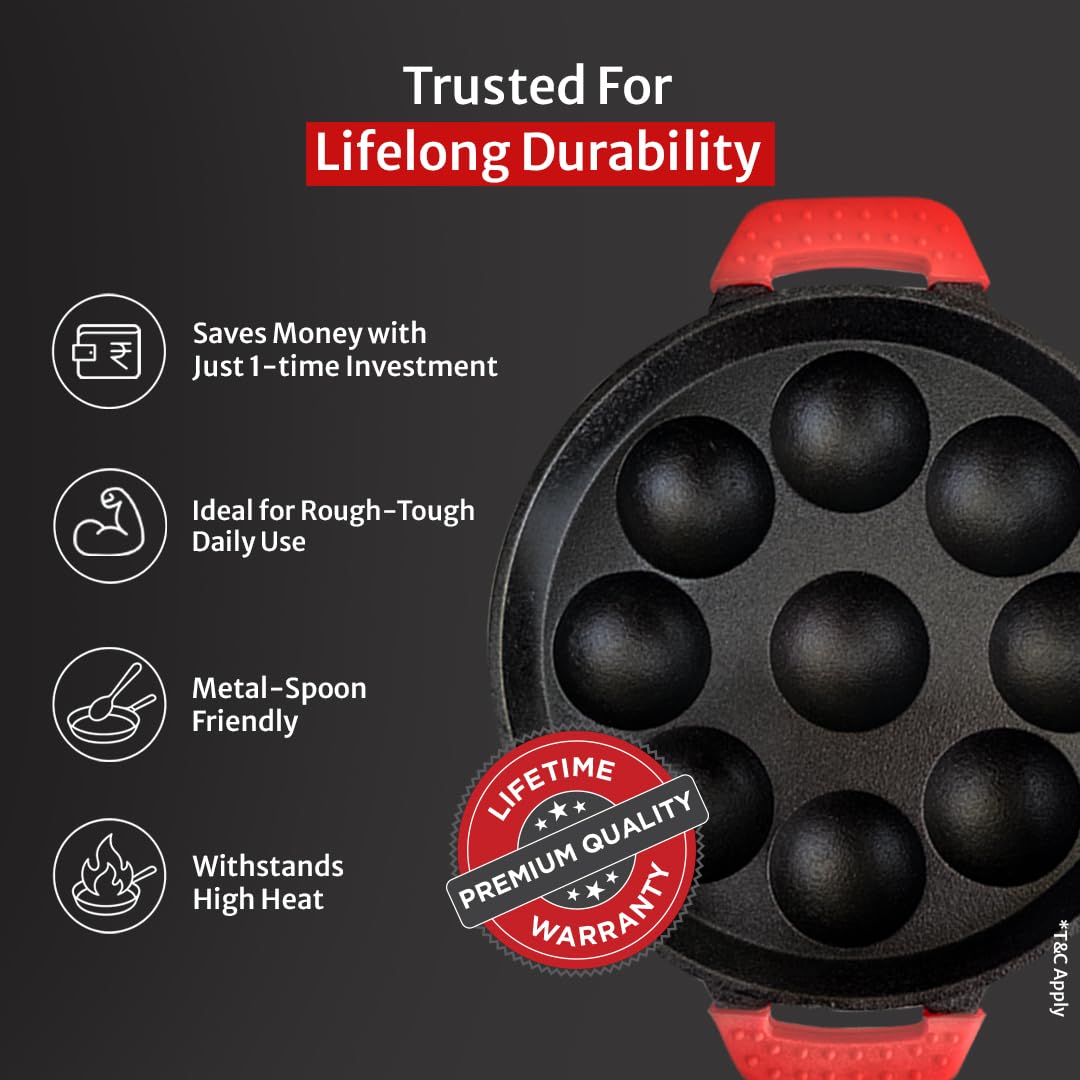 - 𝐇𝐄𝐀𝐋𝐓𝐇𝐘 𝐈𝐍𝐕𝐄𝐒𝐓𝐌𝐄𝐍𝐓 𝐅𝐎𝐑 𝐀 𝐋𝐈𝐅𝐄𝐓𝐈𝐌𝐄: Cast iron paniyarakkal lasts for generations thus saving you a lot of money in the long run. High-quality cast iron also heats quickly, evenly and retains heat longer. Thus saving you both gas and money, daily. TRUSTED FOR LIFELONG DURABILITY: Crafted with high quality cast iron, this heavy-duty cookware is designed for long-lasting use, offering reliable performance for decades. Built to last for generations, this paniyarakkal is designed to withstand high heat and is ideal for rough-tough daily use without any warping. Built to withstand the demands of everyday cooking, it is also scratch-resistant and metal spoon friendly.