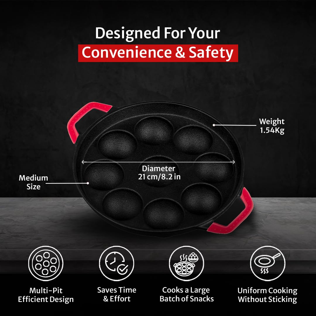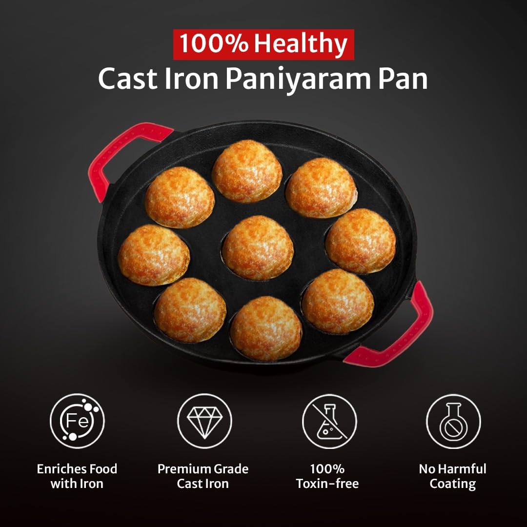 - 𝟏𝟎𝟎% 𝐇𝐄𝐀𝐋𝐓𝐇𝐘 𝐂𝐀𝐒𝐓 𝐈𝐑𝐎𝐍: Made from premium-grade cast iron and without any harmful coatings, this 100% toxin-free cast iron paniyarakkal ensures safe and healthy cooking for you and your family, for years.