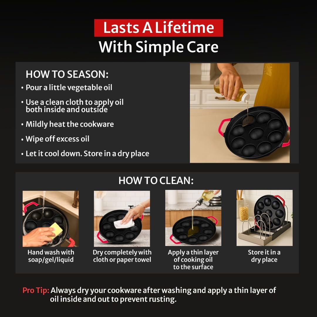 - 𝐍𝐀𝐓𝐔𝐑𝐀𝐋𝐋𝐘 𝐍𝐎𝐍-𝐒𝐓𝐈𝐂𝐊: Ready to use straight out of the box, Pigeon cast iron paniyarakkal comes pre-seasoned with natural vegetable oil. This seasoning creates a naturally non-stick surface that facilitates easy food release and effortless cleaning. The more you use the cast iron paniyarakkal, the better the seasoning becomes enhancing its non-stick properties. For best results, before the first use, a gentle wash and seasoning are recommended.