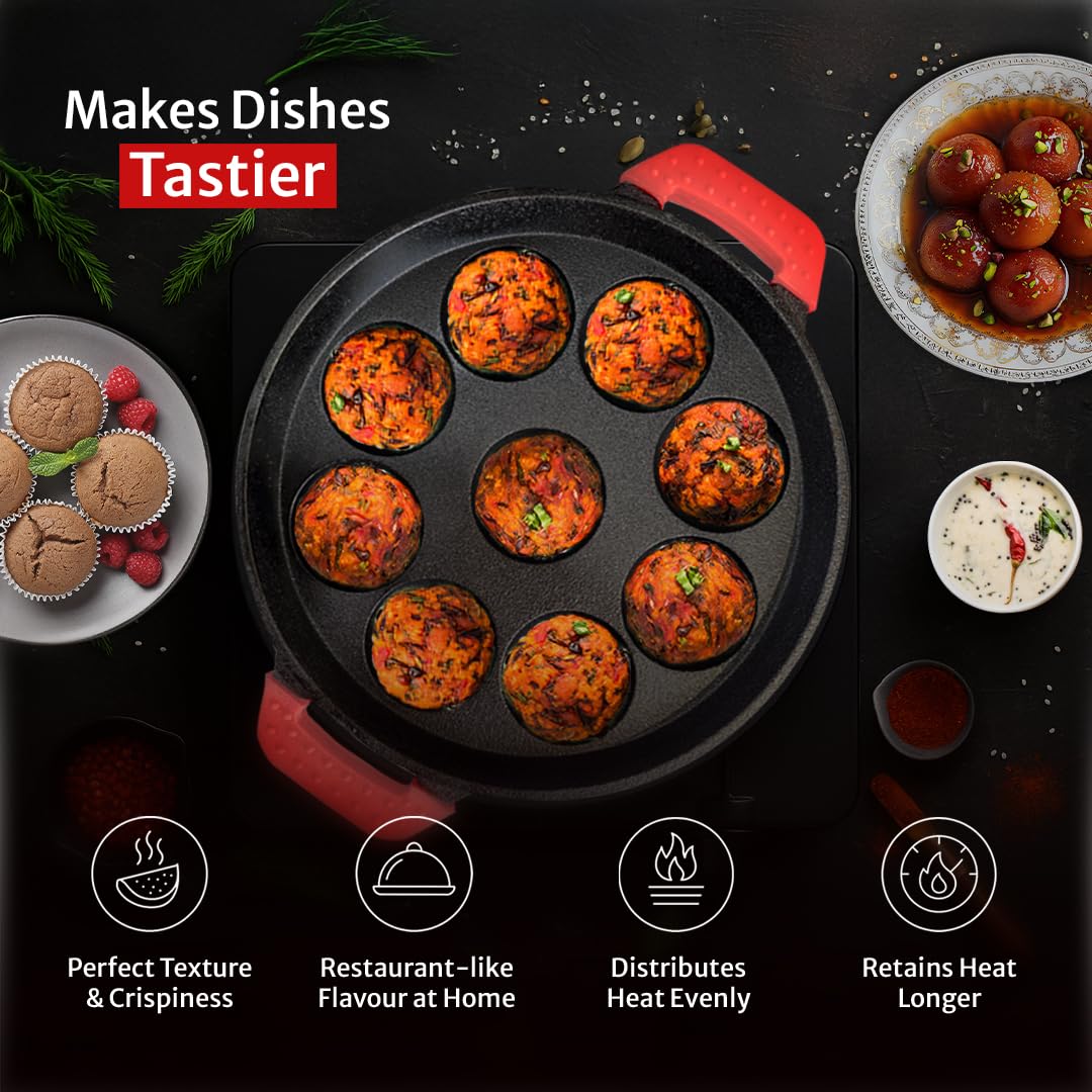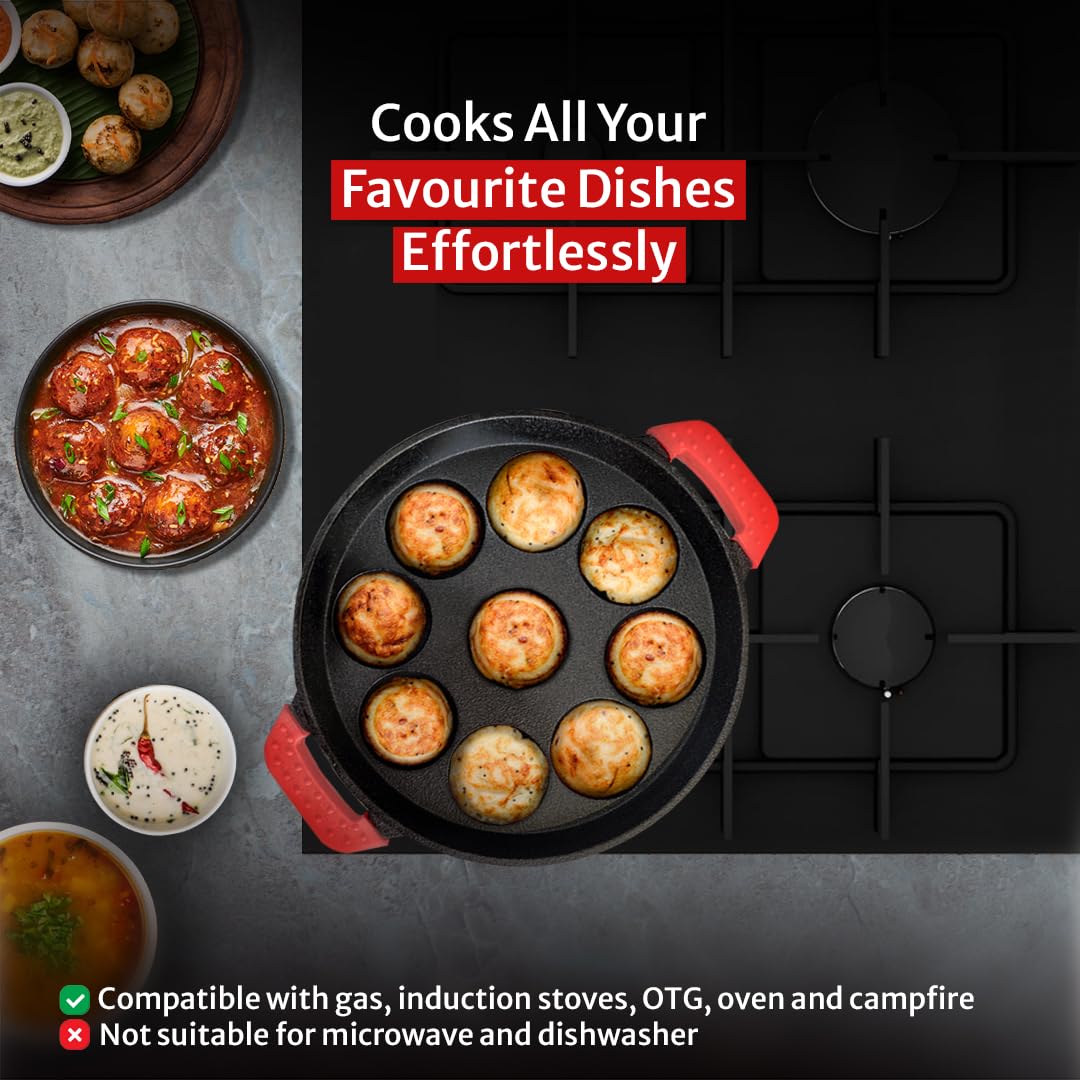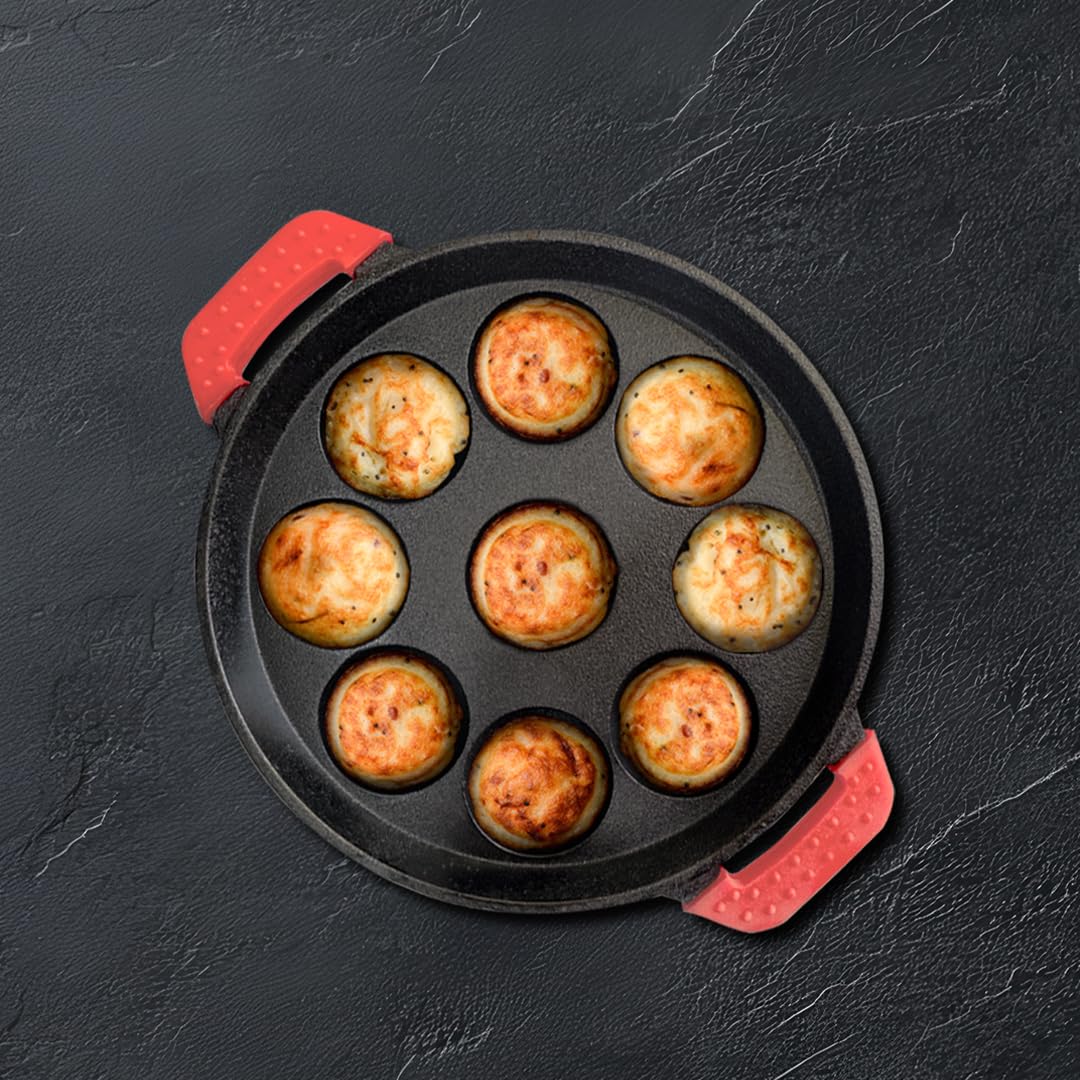 Pigeon Imperi Cast Iron Paniyaram/Appe Pan, 9 Pits, Free Silicone Grips, Pre-Seasoned,100% Toxin-Free, Naturally Nonstick, Paniyarakkal, Appam Patra, Paddu Maker,Strong & Durable, Gas & Induction