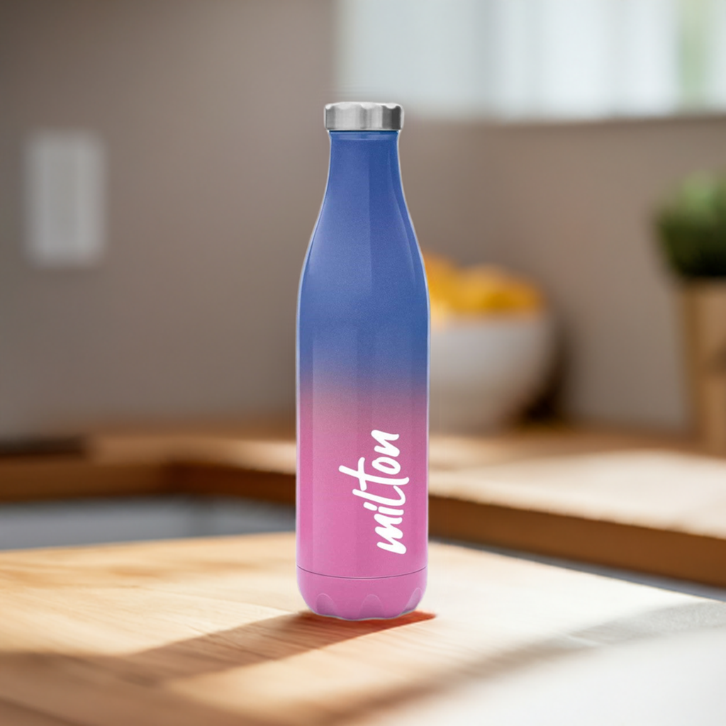 Color: Pink Blue; Material: Stainless Steel; Package Contents: 1-Piece Prudent Water Bottle (1023 ml); Dimensions in cms (L x W x H): 9 x 9 x 32.5