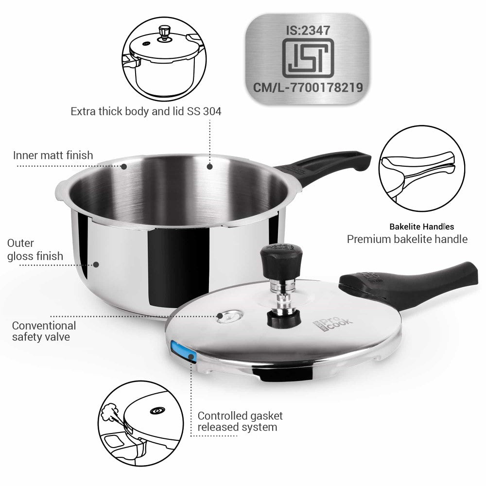 – Milton Pro Cook Pressure Cooker Outer lid is a stainless-steel pressure cooker with three layers of metal for even heat distribution.
